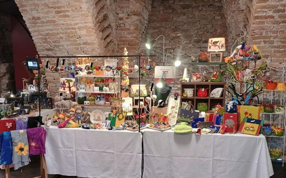 Dann geh hinein und ersteh´ etwas Schönes - aus Filz (auch mit Seide), aus Wolle, oder handbemalte Keramik.